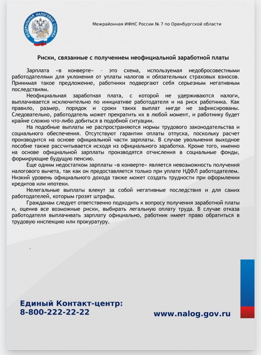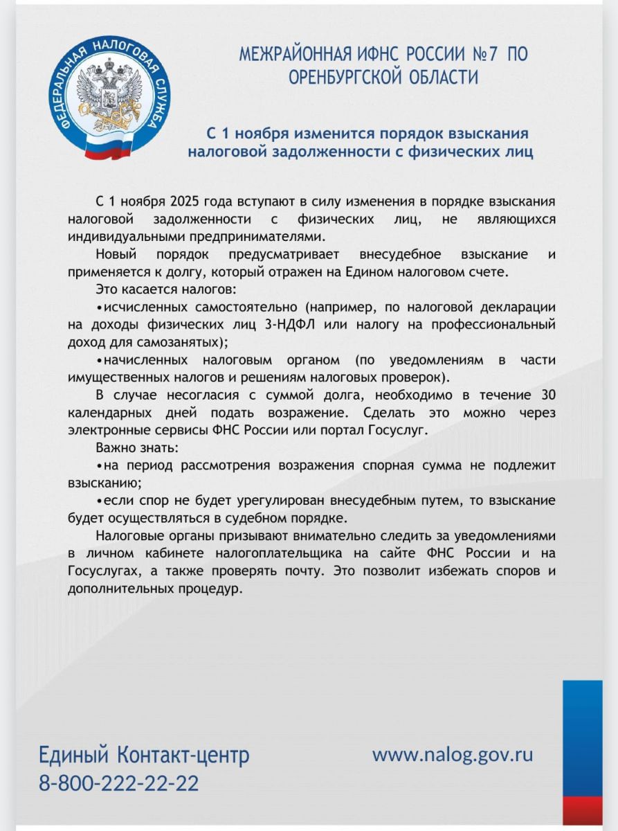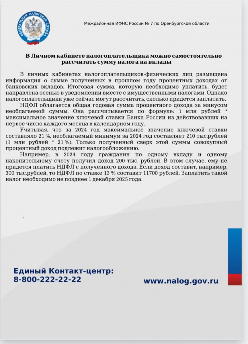 Новости налоговой инспекции Единый день уплаты имущественных налогов и НДФЛ - 1 декабря 2025 года Как оформить справку для подтверждения статуса самозанятого и полученного им дохода При расчете через СБП покупателю обязаны выдать чек С 1 ноября изменится порядок взыскания налоговой задолженности с физических лиц В личном кабинете налогоплательщика можно самостоятельно рассчитать сумму налога на вклады Риски, связанные с получением неофициальной заработной платы С 2025 года можно получить вычет на ГТО Декларация 3-НДФЛ Льготы по имущественным налогам для физических лиц Льготы по имущественным налогам для налогоплательщиков - физических лиц и организаций, пострадавших в результате чрезвычайной ситуации, сложившейся на территории Оренбурсгкой области в связи с весенним паводком 2024 года Льготы по имущественным налогам для физических лиц Льготы по имущественным налогам для юридических лиц Получили доход от продажи Электронная подпись - 2022 Газета Межрайонной инспекции Федеральной налоговой службы № 7 по Оренбургской области №01 2022 Газета Межрайонной инспекции Федеральной налоговой службы № 7 по Оренбургской области №02 2022 Газета Межрайонной инспекции Федеральной налоговой службы № 7 по Оренбургской области №03 2022